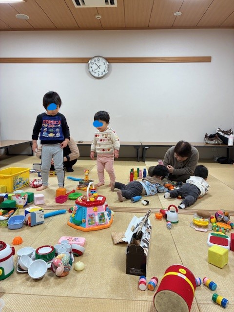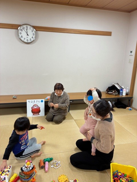 【報告】冬休みで4歳ちゃんも入園以来初めて妹ちゃんと来てくれました。大きくなっててビックリ!! 10か月の双子ちゃんもいっぱい楽しんでくれました。折り紙コマはお土産に。お正月の飾りも手作りです。